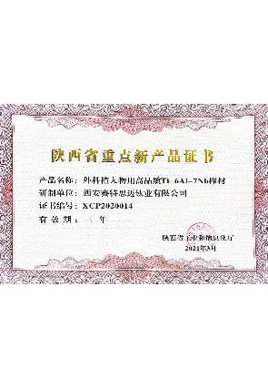 陜西省重點(diǎn)新產(chǎn)品:“外科植入用高品質(zhì)Ti-6Al-7Nb棒材”、“醫(yī)療創(chuàng)傷用鈦合金超厚壁管材”、“接骨板用鈦鎳形狀記憶合金板材”